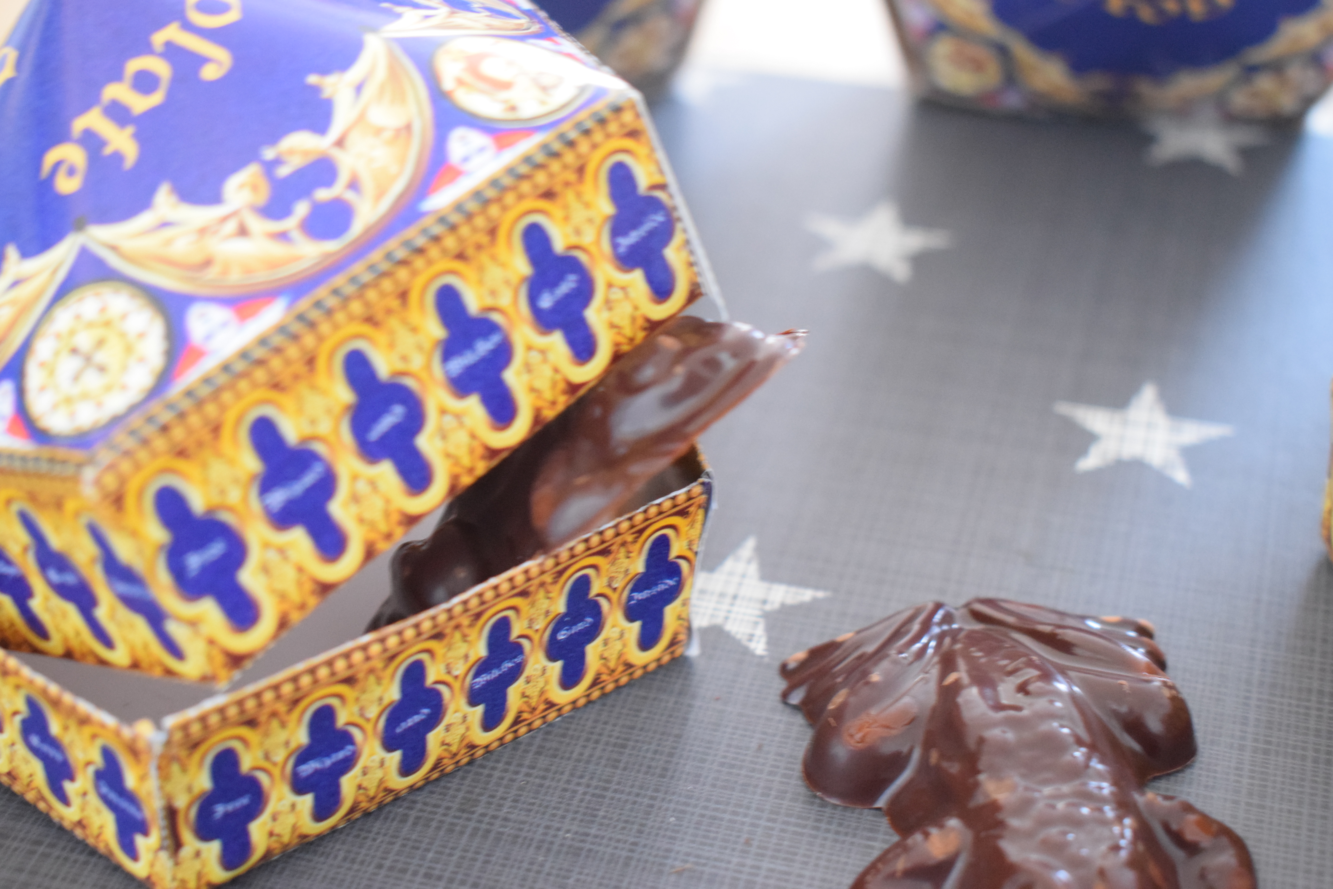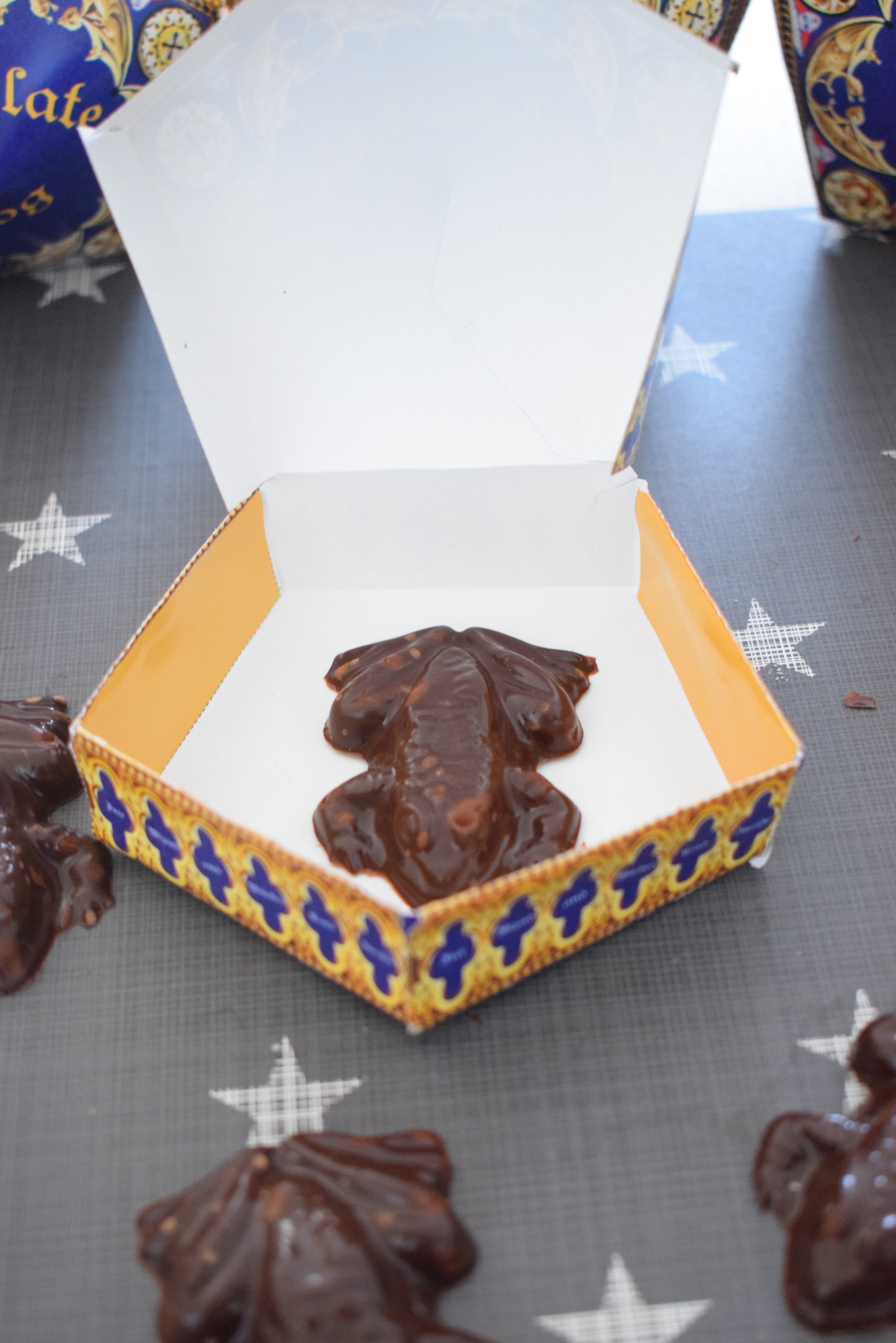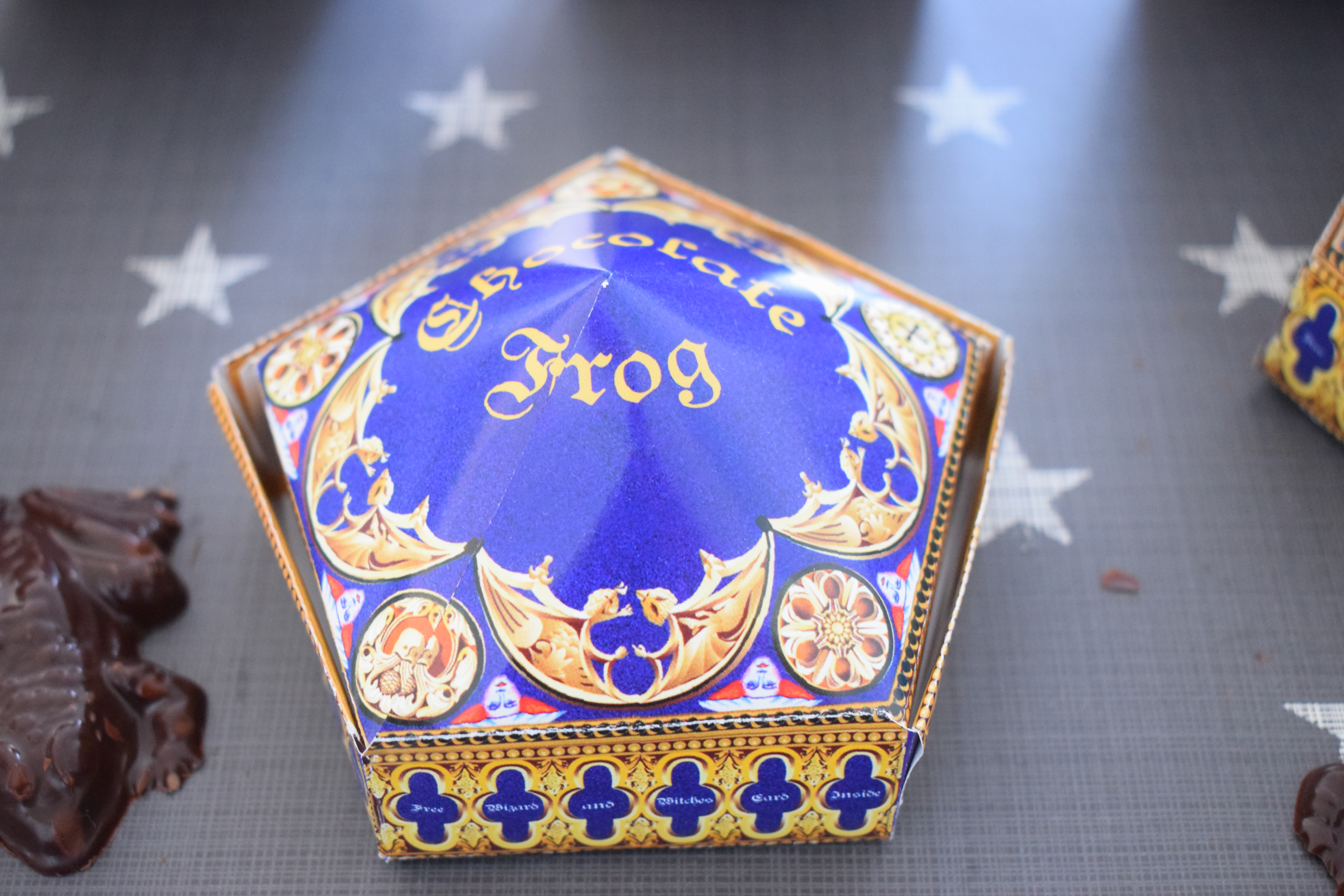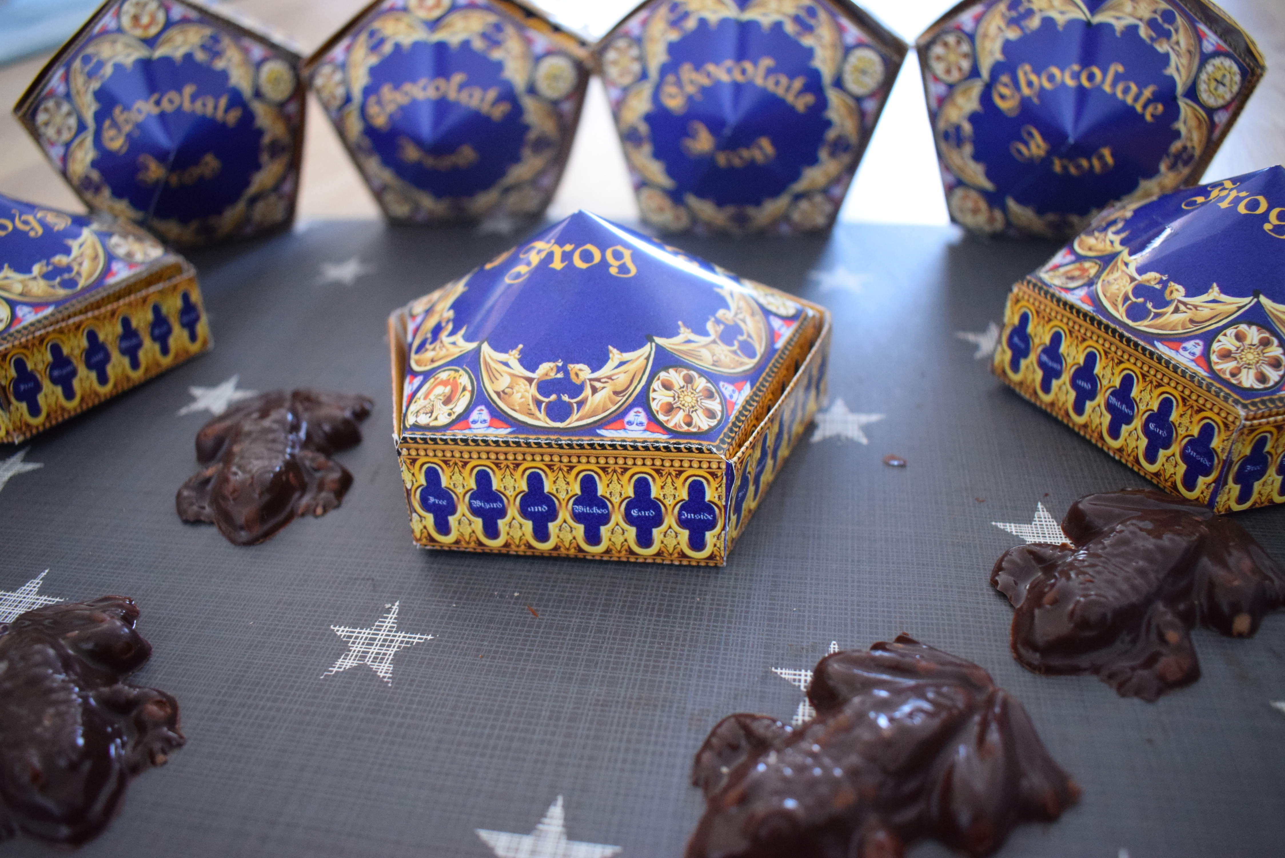 Könnt ihr euch noch an die Szene im Hogwartsexpress im ersten Film erinnern? Harry und Ron haben sich gerade getroffen und Harry kauft jede Menge Süßigkeiten ein. Unteranderem sind da auch Schokofrösche dabei und Ron warnt Harry noch, aber sein Frosch macht einen Abgang durch das offene Fenster. Das ist aus dem ersten Film eine meiner Lieblingsszenen. Seit diesem Moment möchte ich meine eigenen Schokofrösche haben. Ich hab es für das Event geschafft mir eine Schokoladenfrosch Form zu besorgen und habe auch die Passenden Packungen dazu gebastelt. Wenn ihr wollt, könnt ihr eure Form hier bestellen. Das Set kommt direkt mit Schokofrosch Verpackungen, somit müsst ihr keine ausdrucken. Einfach ausschneiden und zusammen kleben.